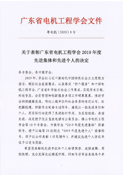 2019年,学会以习近平新时代中国特色社会主义思想为指导,顺应社会发展需求,认真落实“四个服务”和中国电机工程学会、广东省科学技术协会工作要求,实现学术引领、科技普及、会员管理和创新服务多项工作硕果累累,推进学会持续健康发展,得到上级单位和社会各界的肯定认可。在把握机遇、积极作为的奋斗过程中,涌现出一批先进单位和个人,用实际行动发挥了先进标杆作用。为总结经验、表扬先进,决定授予低压直流电源专业委员会、佛山市电机工程学会等10个专委会、市级学会“2019年度先进集体”荣誉称号,授予江海等20位同志“2019年度先进个人”荣誉称号,现予以公布表彰(详见附件),并建议先进个人所在单位予以适当奖励。
