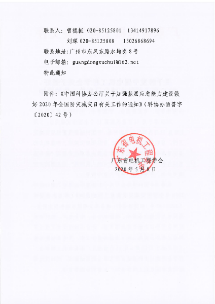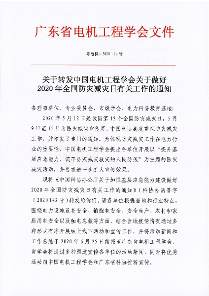 现将《中国科协办公厅关于加强基层应急能力建设做好2020年全国防灾减灾日有关工作的通知》(科协办函普字〔2020〕42号)转发给你们。请各单位根据当地和行业特点,围绕电力设施设备安全、输配电安全、安全生产、农村和家庭用电安全以及触电急救等方面,结合当地疫情情况通过多种形式有序开展线上线下活动和宣传工作,并将活动新闻和工作总结于2020年6月25日前报至广东省电机工程学会,省学会将通过多种渠道宣传各单位的活动新闻,同时将优秀活动向中国电机工程学会和广东省科协推荐宣传。