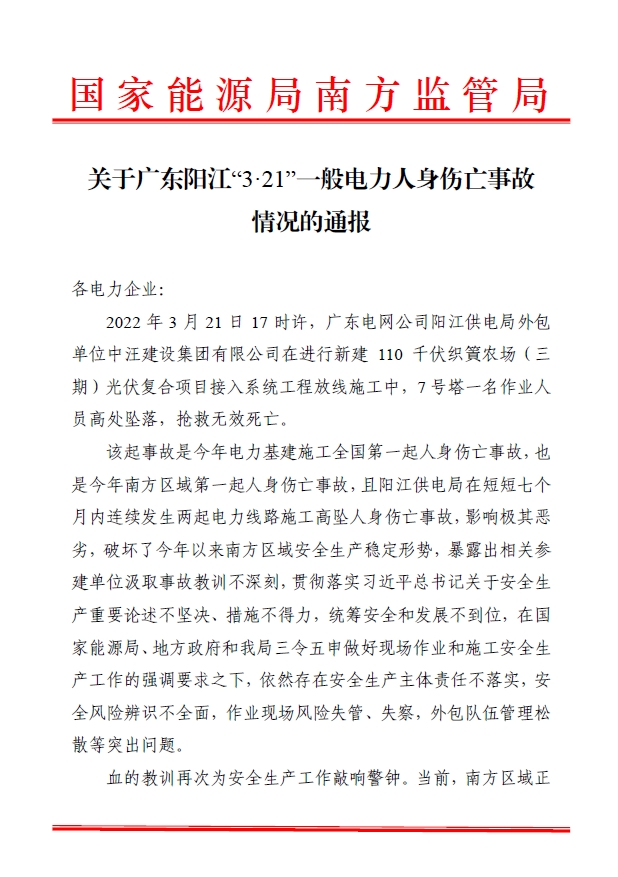 国家能源局南方监管局关于广东阳江“3.21”一般电力人身伤亡事故情况的通报