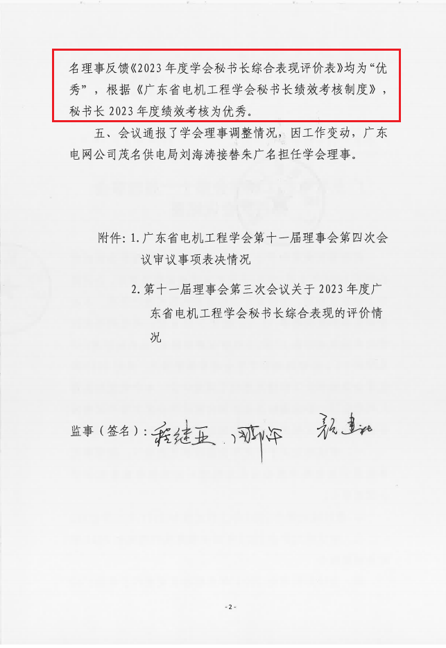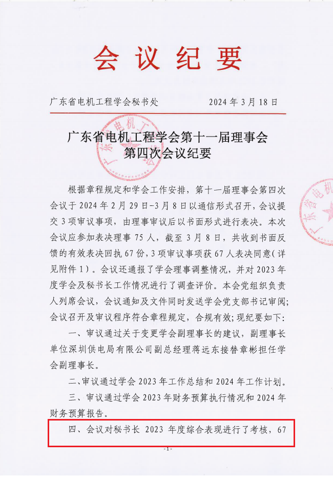 2024年2月29日至3月日,我会以通信形式召开第十一届理事会第四次会议,本次会议应参加表决理事75人,实际参加表决理事67人。会议表决通过对我会秘书长2023年度综合表现进行考核。67名理事反馈《2022年度学会秘书长综合表现评价表》均为“优秀”,根据《广东省电机工程学会秘书长绩效考核制度》,秘书长2023年度绩效考核为优秀。